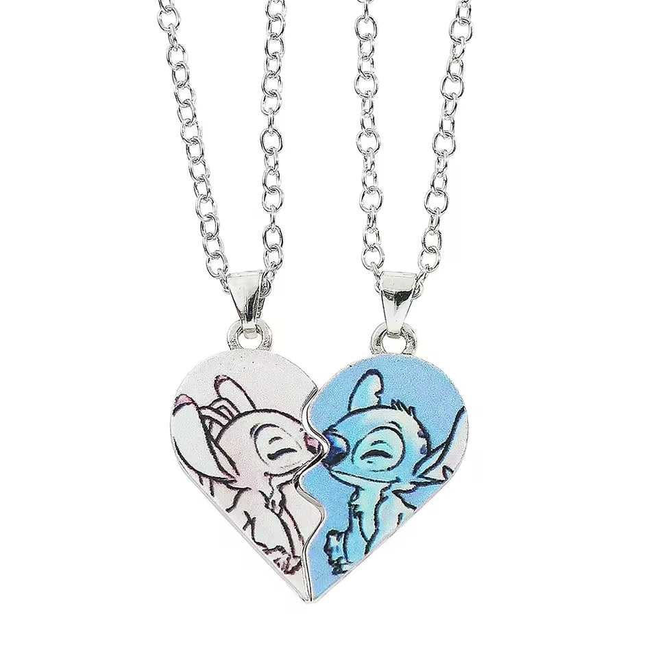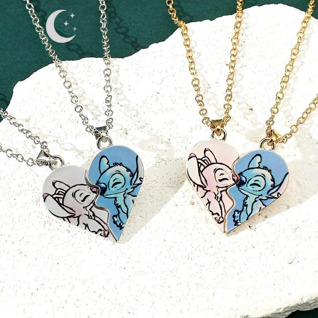 Celebre o amor estes adoráveis colares de coração inspirados nos personagens Stitch e Angel. Cada colar apresenta uma metade do coração com uma imagem dos dois personagens se encontrando ao centro, criando um design encantador e romântico. Disponível em cores prata e dourado, esses colares são perfeitos para compartilhar com alguém especial.